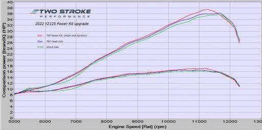 This design is slightly higher compression than the stock head but still safe for 98 RON pump fuel with appropriate jetting. It offers improved bottom/mid power over the stock design and is best suited to trail riding, offroad racing or MX riders who want max midrange pull.